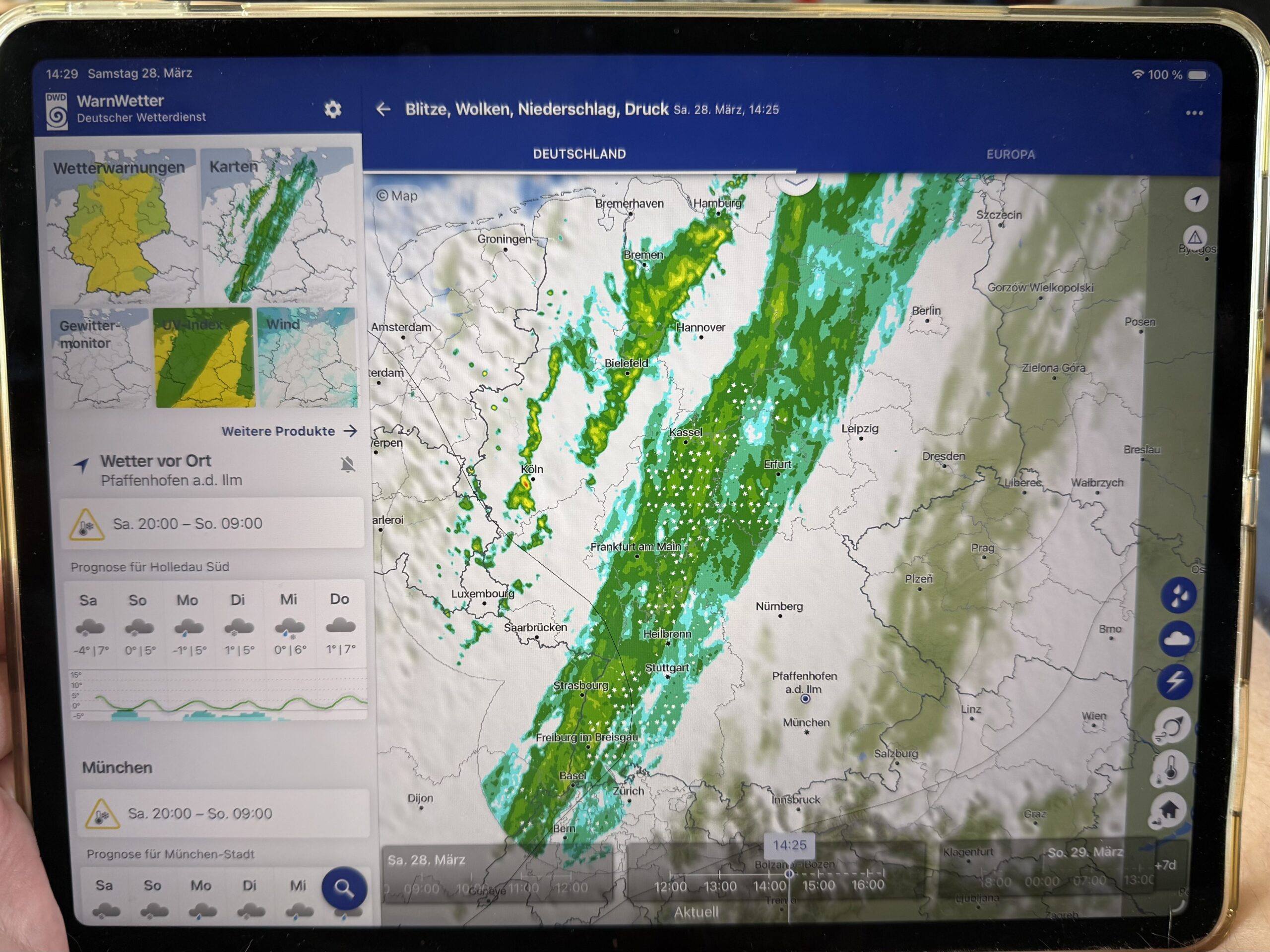 *ja, hier südöstlich des Schrägstrichs, der Deutschland gerade wetterlich teilt, ist’s noch schön, siehe Radarbild; und dann muss ich mal die CD (bzw. deren Kopie auf dem Raspi) zum und vom Konzert vorgestern anhören: