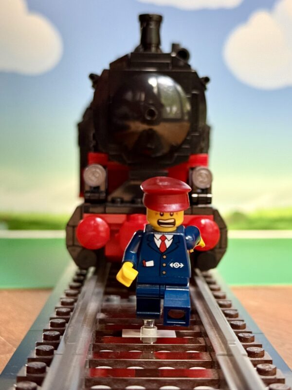 Ist dieser Lego-Eisenbahner ein Lego-Purist oder warum sonst läuft er vor einer BlueBrixx-Lok davon?