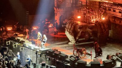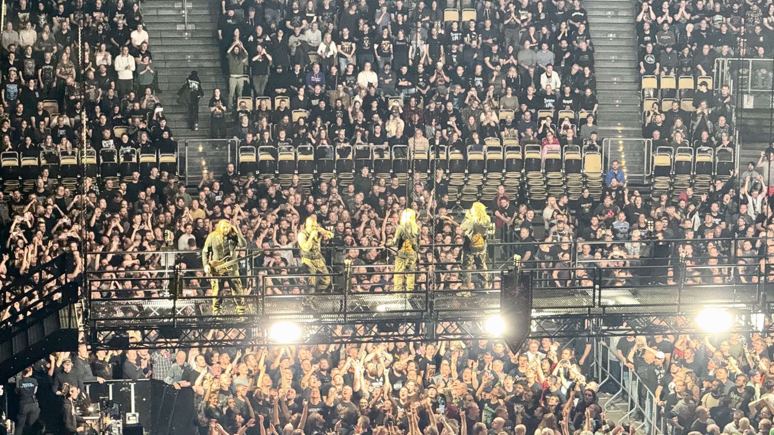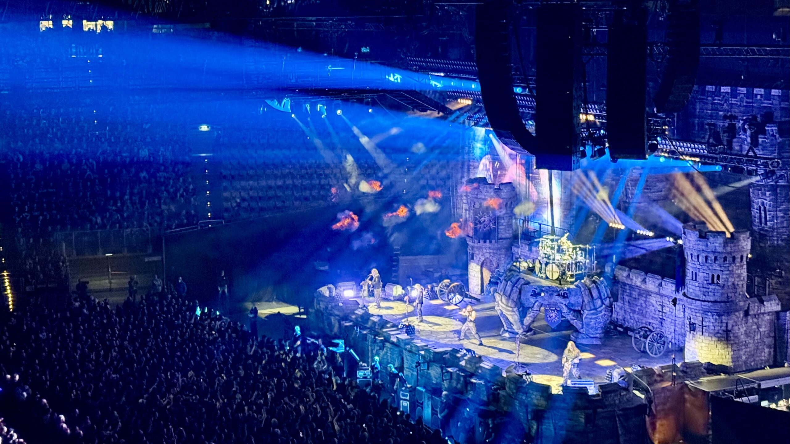 Nachdem Sabaton sich anfangs vorwiegend mit militärhistorischen Themen des letzten Jahrhunderts befasst hatten, geht’s mittlerweile weiter in die Vergangenheit, gerade im aktuellen Album und der zugehörigen Tour, was man nicht nur am Burgen-Bühnenbild sieht – kein Panzer und roter Dreidecker wie noch im Cobi-Klemmbausteinset – sondern auch an den Spielszenen wie insbesondere dem Intro auf der kleinen Bühne in der Mitte, das nach der Umbaupause um 20:34 begann: Zunächst Napoleon Bonaparte, dann Dschingis Khan, schließlich Julius Caesar (der von Napoleon erstochen wird (vom Khan mit “that escalated quickly” kommentiert), aber trotzdem später noch auf der Hauptbühne erscheint) – zum Glück alle auf Englisch und nicht in ihrer jeweiligen Sprache –, bevor sie dann von der Band als Tempelritter unterbrochen werden.