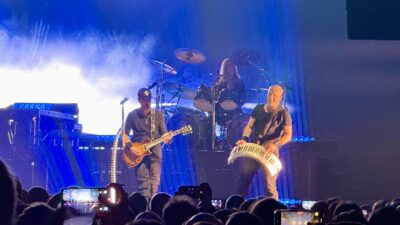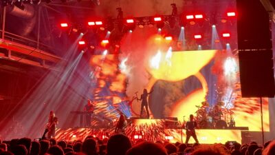 …insbesondere wenn der (also der Riser, nicht der Gitarrist) genauso leuchtstark und hochauflösend strahlen kann wie die große Videowand im Hintergrund (die, wie ein Testbild in der Pause zeigte, 4K UltraHD kann – aber sicher “ein paar” cd/m² heller als euer Fernseher zuhause)…