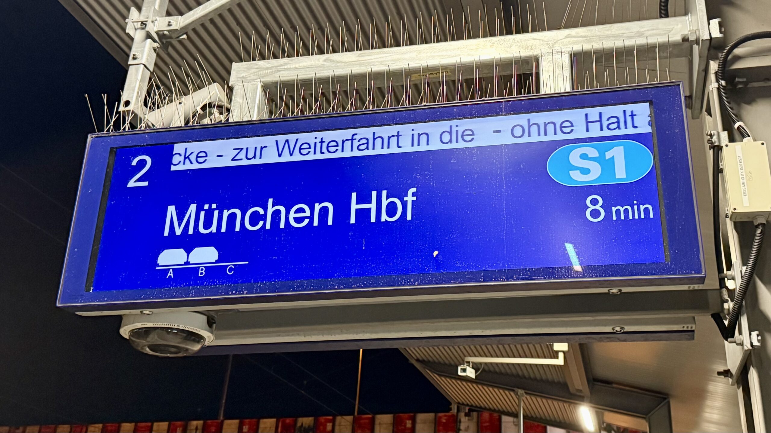 Ab ca. 22:30 wegen Bauarbeiten eingeschränkter S-Bahn-Betrieb, die – dank zeitigem Konzertende gut erreichbare – S1, mit +4 bis +5 unterwegs, fuhr nur zum Starnberger Flügel ohne Halt an der Hackerbrücke, und zur Weiterfahrt in die. Tja, keine Ahnung, was die Anzeige uns sagen wollte: