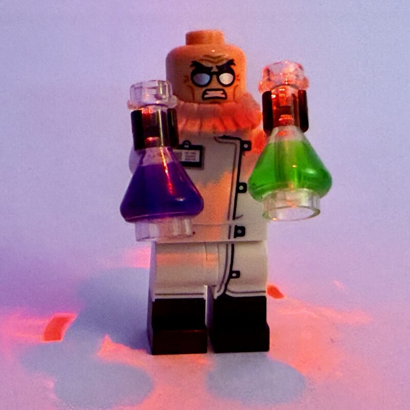 Ist dieser Lego-Eisenbahner ein Lego-Purist oder warum sonst läuft er vor einer BlueBrixx-Lok davon?