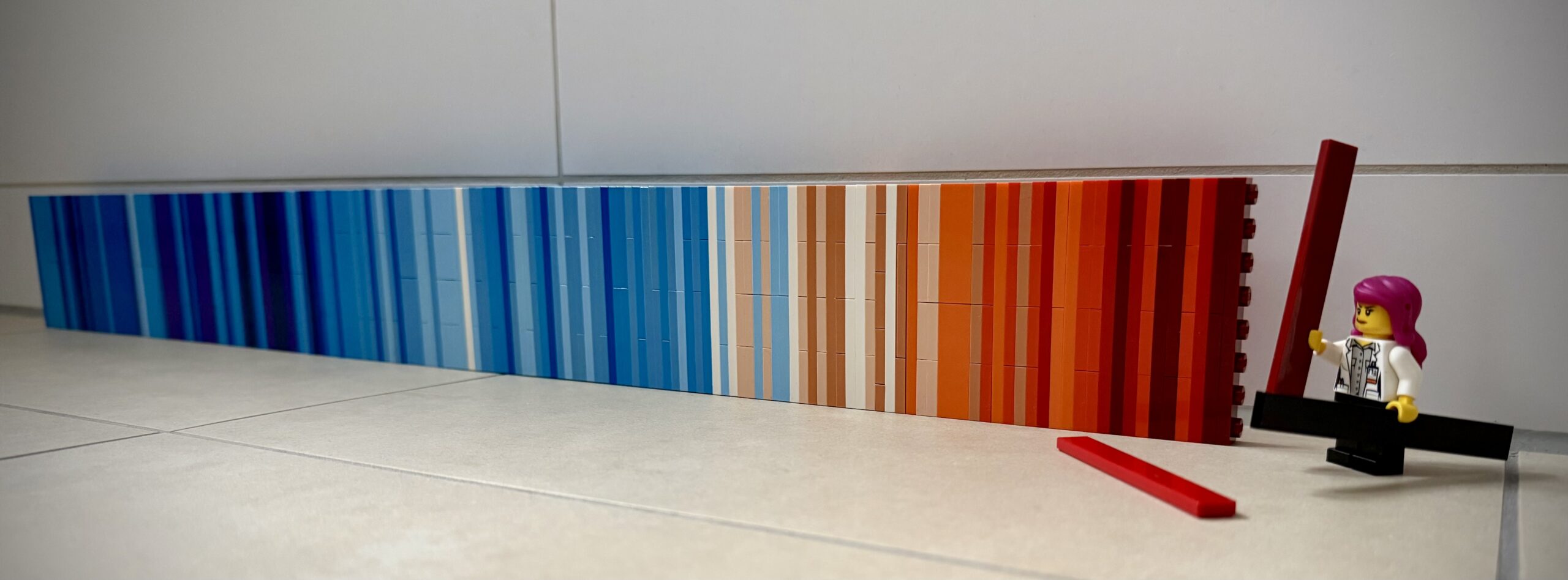 Wärme. Davon kann’s auch zu viel geben, wie man u.a. an den vmtl. bekannten Klima-Streifen sieht, die ich hier mit Lego-Platten nachgebaut habe – mit Anpassungen an die Lego-Farbpalette1 –, und zwar für die globalen Werte von 1850 bis 2024:
